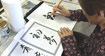 | 筆を握り、見本をみながら書初め!素晴らしい作品が出来上がりました。 |